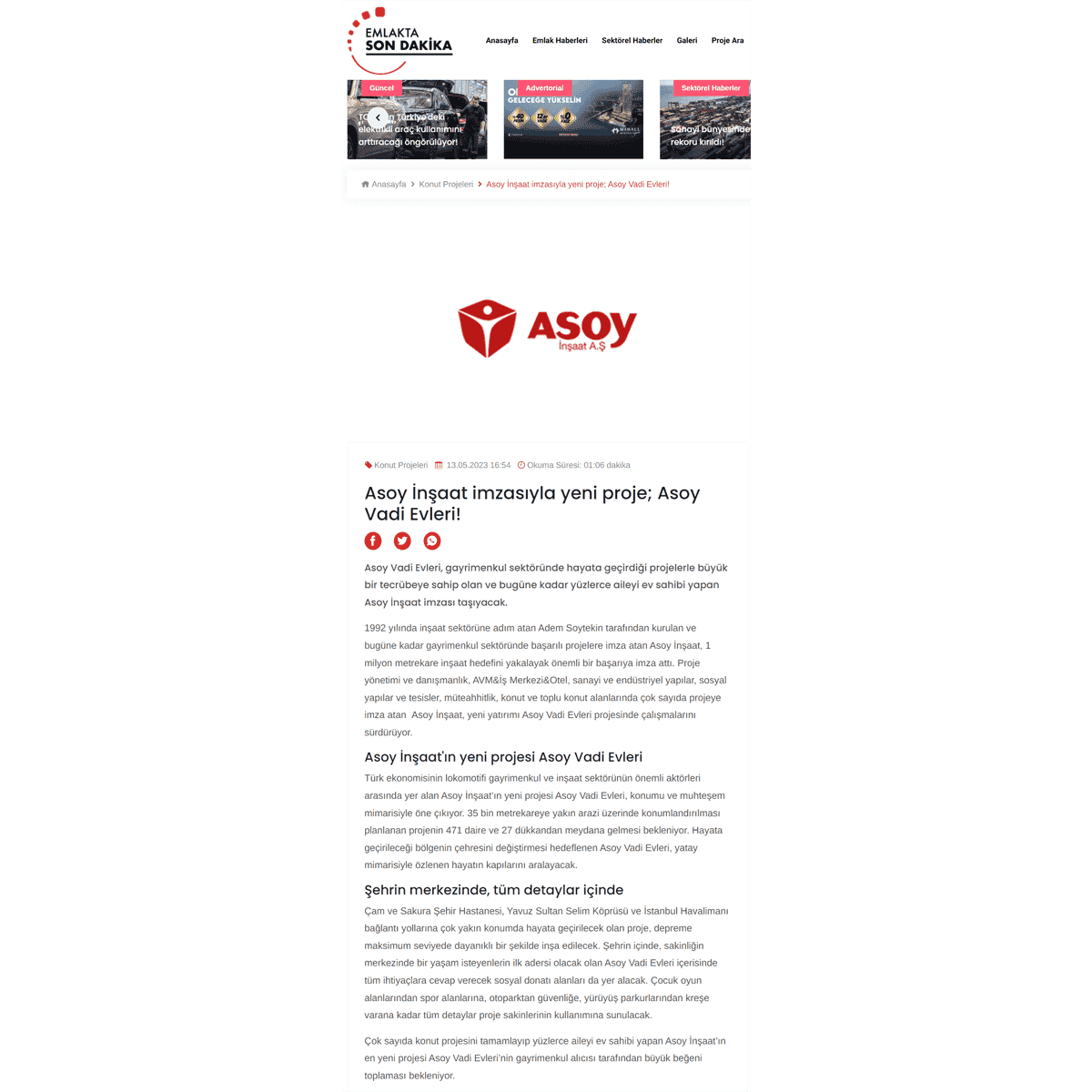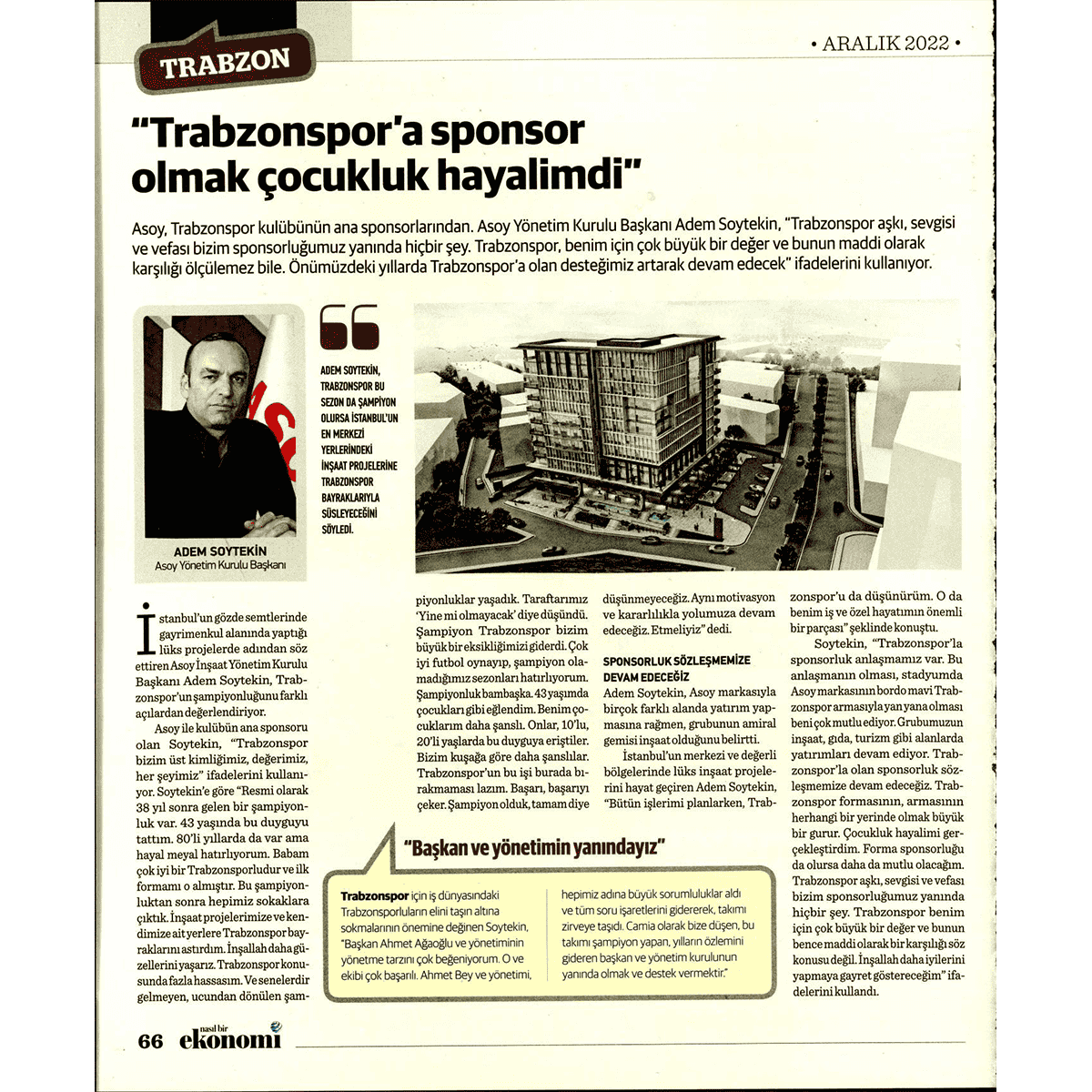 Adem Soytekin, Asoy İnşaat’ın kurucusu ve Asoy Group’un Yönetim Kurulu Başkanıdır. İş hayatına 1992 yılında Günal İnşaat ile adım atan Soytekin, kısa sürede sektörün güven duyulan isimlerinden biri haline gelmiştir. Günal İnşaat ile başlayan girişimcilik yolculuğu, Kaldis İnşaat markasıyla devam etmiş ve 2010 yılında kurulan Asoy İnşaat ile yeni bir ivme kazanmıştır. Asoy İnşaat, kuruluşundan itibaren farklı ölçeklerde birçok projeye imza atarak, inşaat ve gayrimenkul geliştirme alanında yenilikçi çözümler üretmiştir. 2014 yılı itibarıyla ise Asoy Group çatısı altında kurumsal yapısını genişleten şirket, gayrimenkul yatırımlarının yanı sıra gıda, enerji ve lojistik gibi stratejik sektörlerde de faaliyet göstermeye başlamıştır. Bugün Asoy Group, farklı alanlarda sürdürdüğü yatırımlarıyla ülke ekonomisine değer katarken, istihdam ve sürdürülebilir büyüme konularında da önemli katkılar sağlamaktadır. Tüm bu süreçlerde liderlik rolünü üstlenen Adem Soytekin, iş dünyasında uzun vadeli vizyonu, yenilikçi bakış açısı ve güçlü kurumsal yönetim anlayışı ile tanınmaktadır. Adem Soytekin, iş hayatındaki tecrübesini Asoy Group bünyesindeki çalışmalarıyla geleceğe taşımakta; güven, kalite ve istikrar ilkeleri doğrultusunda şirketin büyüme hedeflerini yönlendirmektedir.